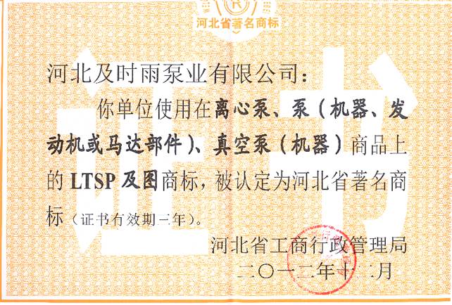 及時(shí)雨品牌被評為河北省商標(biāo)-河北及時(shí)雨泵業(yè)有限公司